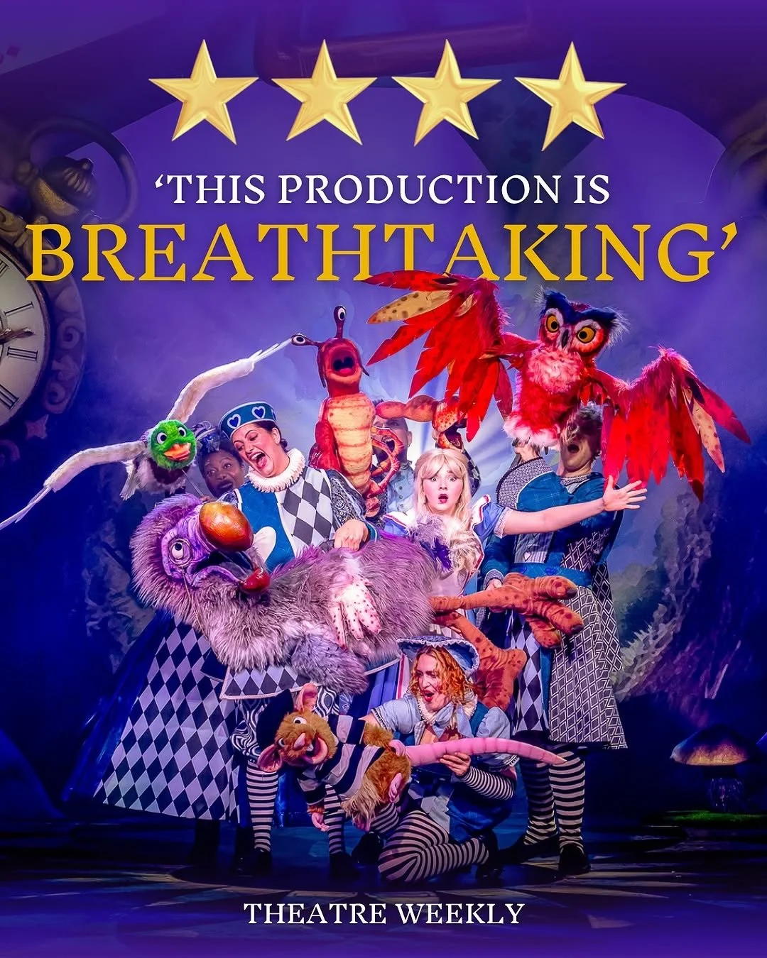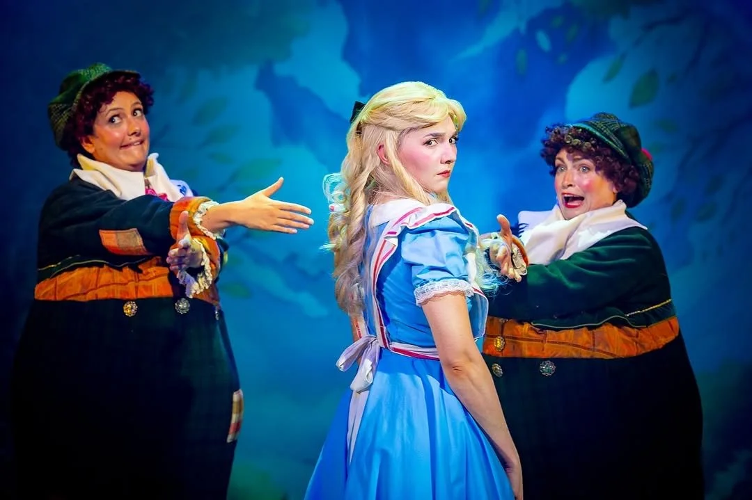 Skye Hallam as Tweedle Dee, Charlotte Bradley as Alice and Katriona Brown as Tweedle Dum